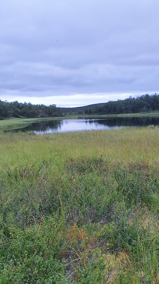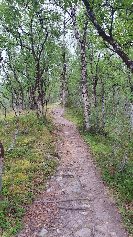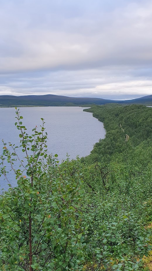Aluksi en tuntenut oloani täysin kotoisaksi tunturikoivikossa. Ajattelin, että se tuo mieleeni etelän nuoren, melko hiljattain hakatun metsän. Kaipasin suurten vanhojen puiden suojan tuntua. Mutta pikkuhiljaa polku viekoitteli mukanaan. Luomusjärvien läpi kulkeva harjupolku oli ihana, joskin leveät mönkijäurat paikoitellen häiritsivät erämaan tuntua. Oli enimmäkseen hyvin hiljaista, vastaantulijoita ei ollut. Satunnaisesti jokin lintu varoitteli jossakin, mutta tunnen huonosti niitä pohjoisen asukkeja, joita ei näe etelässä. Pitäisi joskus ottaa asiakseen niitä vaelluksella kiikarien ja lintukirjan kanssa opetella.