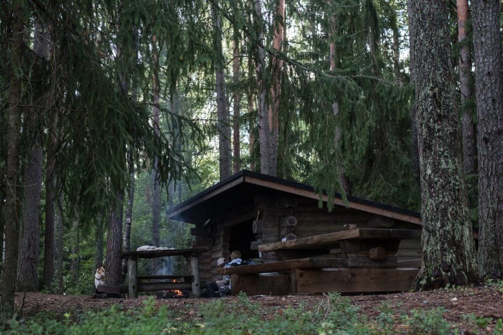 Laavua lähestyttäessä metsä muuttui monimuotoisemmaksi sekametsäksi, jossa lehtipuut ja kuuset muodostivat viehättävän hämyisen sekamelskan. Lapsilla oli jo nälkä, joten ensimmäisenä ryhdyttiin nuotiontekopuuhiin. Metsäpalovaroituksia ei tarvinnut miettiä, sillä olihan päivällä satanut kunnolla, mutta juuri sopivasti illaksi sade oli lakannut ja ilma aivan täydellinen retkeilysää.