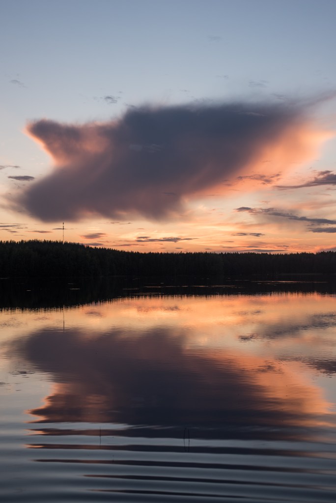 Lasten nukkumaanmenon lähestyessä leppoisan ja riemukkaan laavuiluillan kruunasi kaunis auringonlasku tyynen veden yllä. Oli suorastaan kliseisen kaunis kesäilta. Lopuksi luin vielä lapsille satua, ja sen jälkeen uppouduin teltan viereen lukemaan omaa kirjaa kunnes elokuinen pimeys hiipi pikkuhiljaa ylle kuin pehmeä viltti.