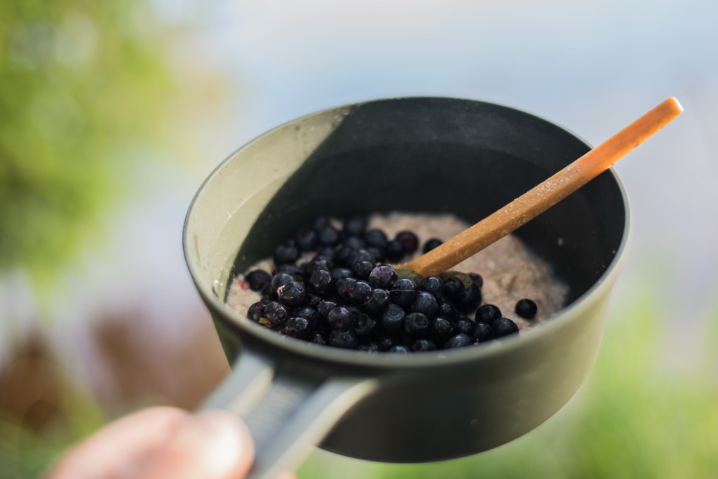 Join kupin kahvia, ja kun aikaa oli, keitin toisenkin. Aamupalalla mikään ei voita puuroa ja tuoreita, vastapoimittuja mustikoita. Ah, miten eeppistä retkeilyä – miten voikaan pakkautua yhteen ihan tavalliseen telttaretkeen kaikki kliseet. Nämä ovat vaan niitä juttuja, kun retkeilyyn rakastunut ei kyllästy ikinä. Kamera räpsyi, sillä järjestelmäkameralla kuvaaminen on minulle rakkain tapa toteuttaa luovuuttani, ja kuvausintoa oli vähän päässyt patoutumaan kameran unohduttua Kevon vaellukselta.