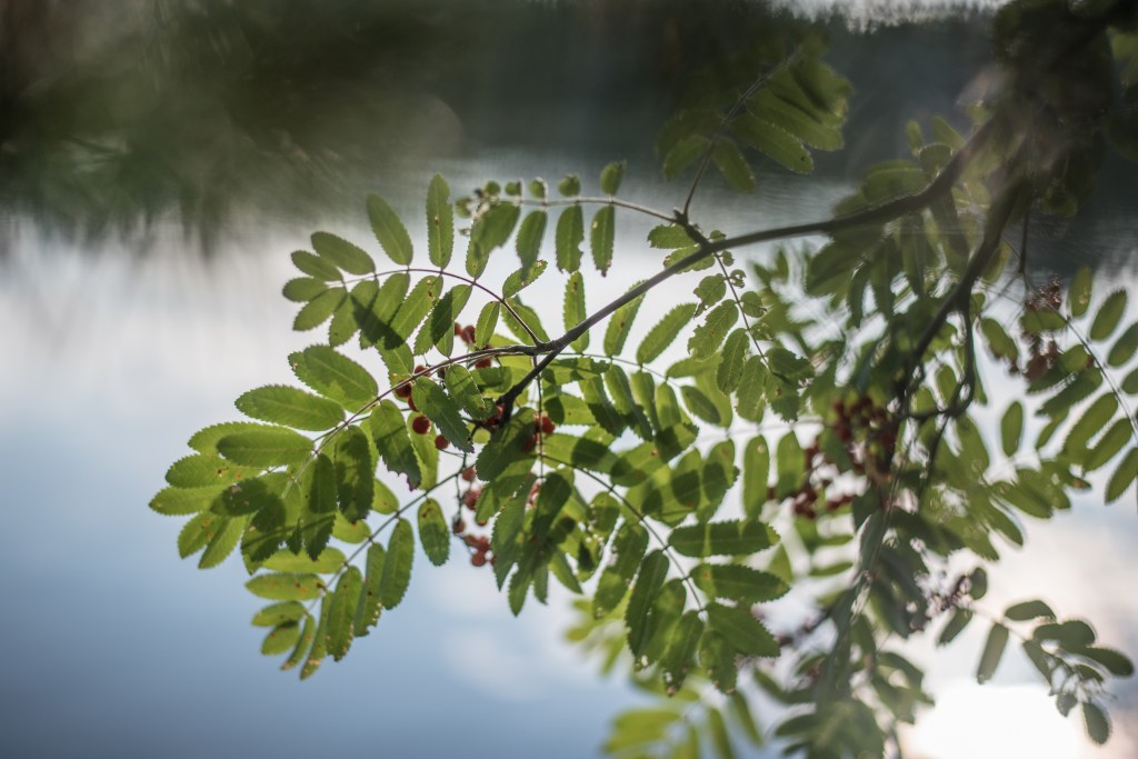 Aamulla heräsin aikaisin tuntikausia ennen lapsosia, jotka vetävät aina teltassa hillittömän sikeät ja ympäripyöreät unet. Seurailin syvän rauhan vallitessa, samalla sydän täynnä aamun kuplivaa intoa, miten hentoinen aamun utu väistyi aamun auringonsäteiden tieltä. Ilmassa väreili kesän ja syksyn kohtaaminen – elokuun tuntua parhaimmillaan. Pihlajanmarjat lehtineen näyttivät uskomattoman kauniilta tyyntä, vain aamuauringon säteistä väreilevää vedenpintaa vasten. Ai että miten rakastankaan hiljaisia aamuja luonnon ympäröimänä. ”Jokainen päivä hänen voimansa on uusi”, kuten Raamatussakin sanotaan, ja erityisesti sen tuntee ytimissä aamuisin. Rakastan kyllä lapsianikin, heh, ja mikäs sen parempaa jos kaikenlaisia suuria rakkauksia voi ympätä yhteen.